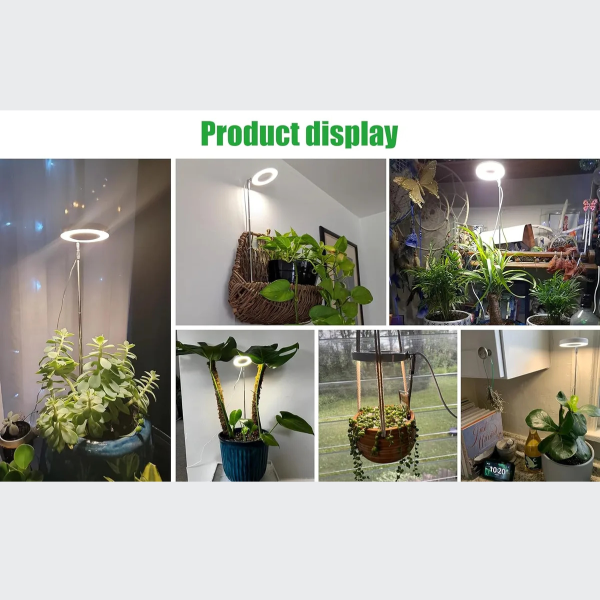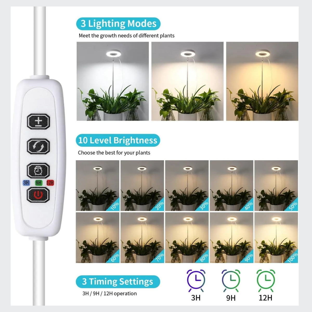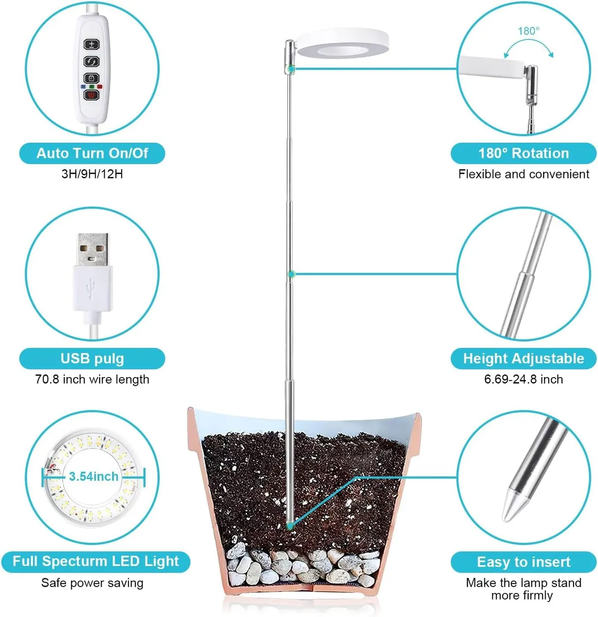 ADJUSTABLE HEIGHT: This grow light features a height-adjustable design that allows you to position the light at the ideal distance for your plants’ growth needs.. FULL SPECTRUM LEDs: Equipped with full spectrum LEDs that emit wavelengths of light optimized for photosynthesis, promoting healthy growth for a wide variety of indoor plants.. AUTO TIMER FUNCTION: The built-in auto timer offers 4, 8, or 12 hour settings to keep your plants on a consistent light/dark cycle for maximum growth.. DIMMABLE BRIGHTNESS: Featuring 4 brightness levels that are easily adjusted based on the light needs of different plant types at various growth stages.. COMPACT SIZE: Despite its powerful lighting capabilities, this grow light maintains a compact design that easily fits on shelves or countertops, ideal for small spaces and a variety of potted plants.