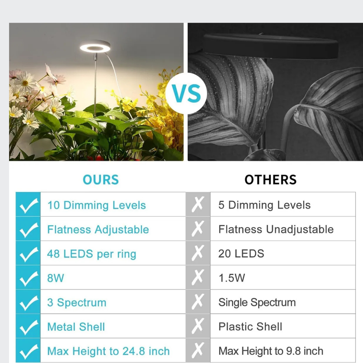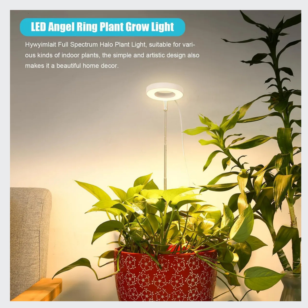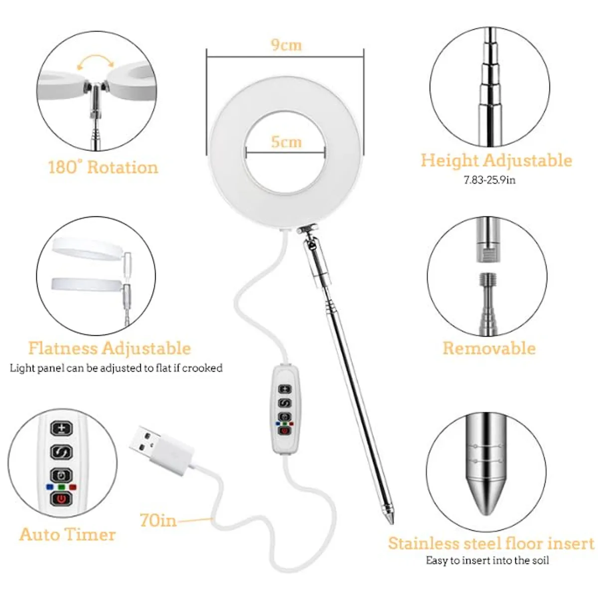 ADJUSTABLE HEIGHT: This grow light features a height-adjustable design that allows you to position the light at the ideal distance for your plants’ growth needs.. FULL SPECTRUM LEDs: Equipped with full spectrum LEDs that emit wavelengths of light optimized for photosynthesis, promoting healthy growth for a wide variety of indoor plants.. AUTO TIMER FUNCTION: The built-in auto timer offers 4, 8, or 12 hour settings to keep your plants on a consistent light/dark cycle for maximum growth.. DIMMABLE BRIGHTNESS: Featuring 4 brightness levels that are easily adjusted based on the light needs of different plant types at various growth stages.. COMPACT SIZE: Despite its powerful lighting capabilities, this grow light maintains a compact design that easily fits on shelves or countertops, ideal for small spaces and a variety of potted plants.